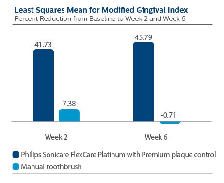 Following six weeks of product use, LS Mean (SE) for the Sonicare group was 1.23 (0.04), and for manual toothbrush it was 2.22 (0.04), p-value <0.0001. Expressed as percent reduction versus Baseline, this is 45.79% reduction for Philips Sonicare FlexCare Platinum with Premium plaque control brush head, and -0.71% for manual toothbrush.