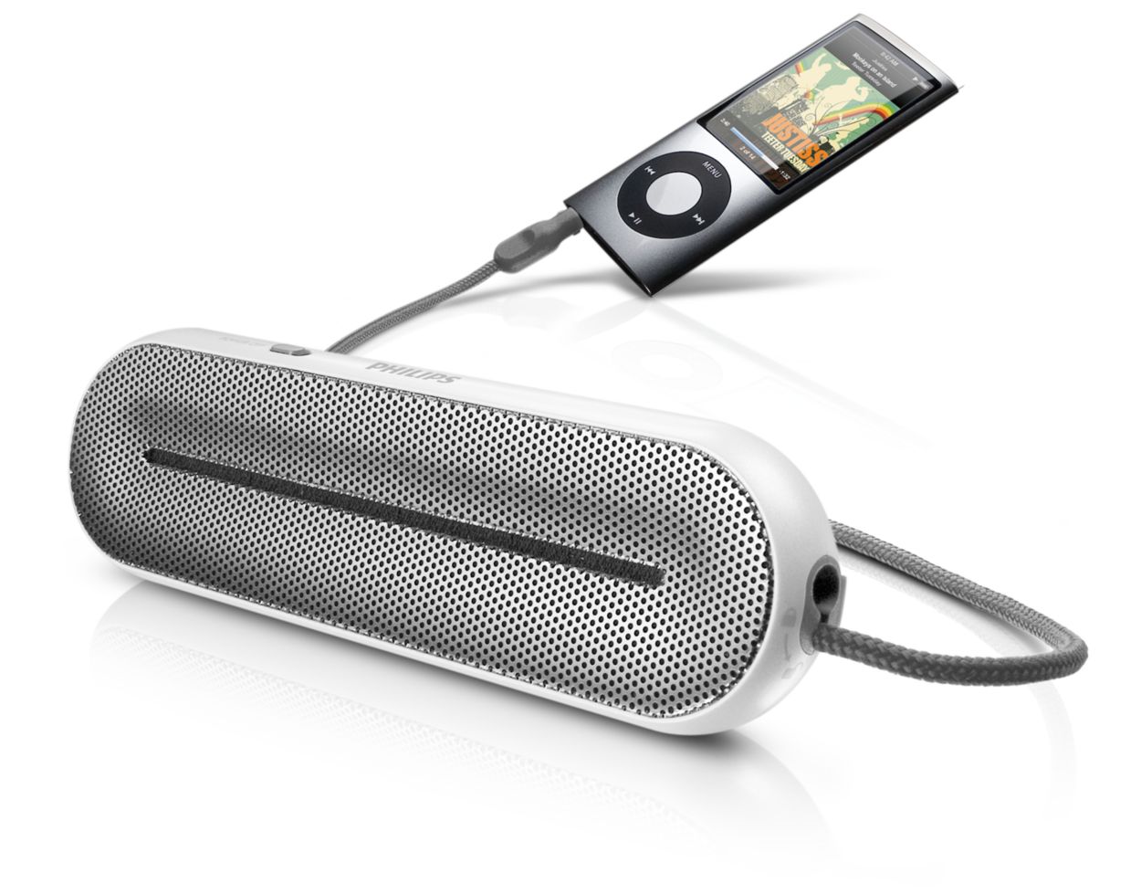 These speakers are ready to go! When it's time to take your music on the go, reconnect the line-in cable and secure it in place to use as a convenient lanyard.